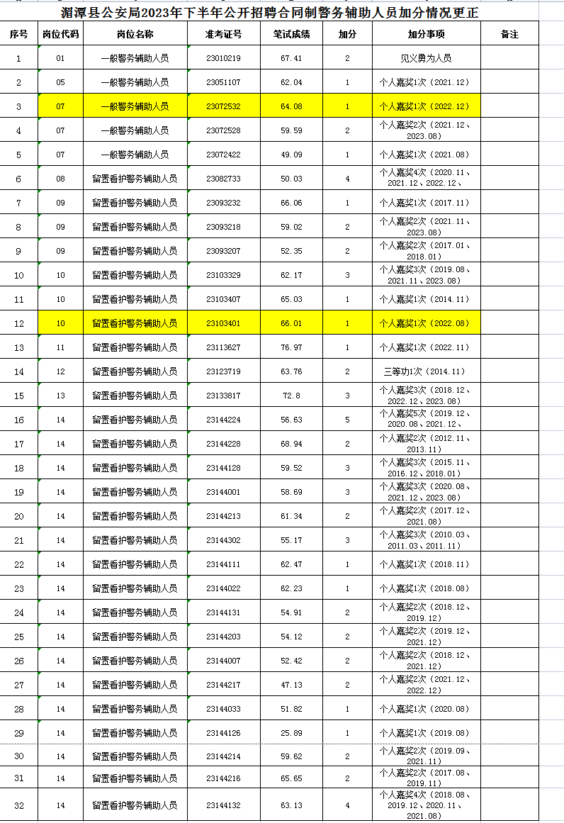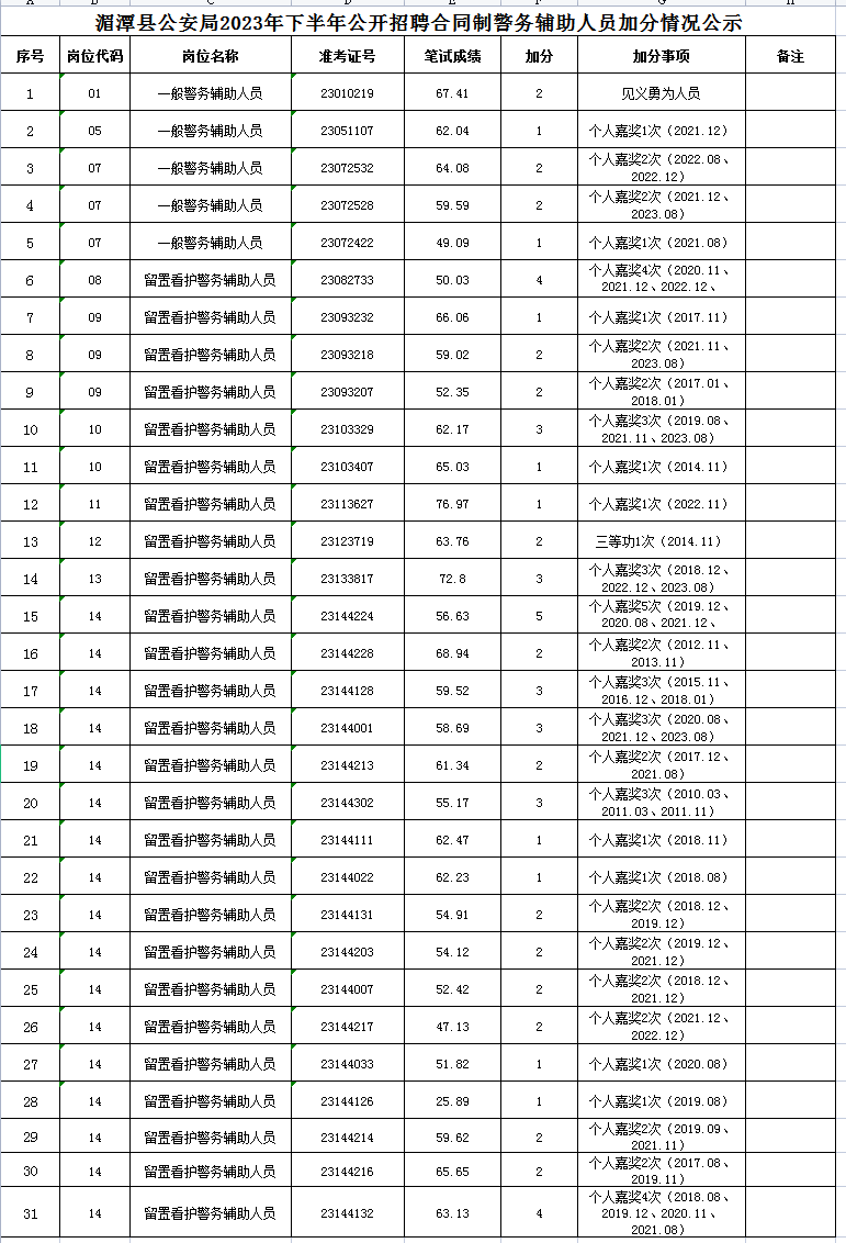 根据《湄潭县公安局2023年下半年公开招聘合同制警务辅助人员简章》要求,对考生提供的加分材料进行了审查,并于2023年12月20日对加分情况进行了公示。