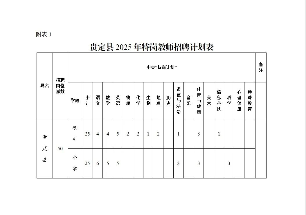 2025年贵定县计划招聘“特岗计划”教师50名。其中,中央“特岗计划”招聘50名,用于招聘农村初中、小学教师。具体分学科岗位招聘计划详见《贵定县2025年特岗教师招聘计划表》(附表1)。