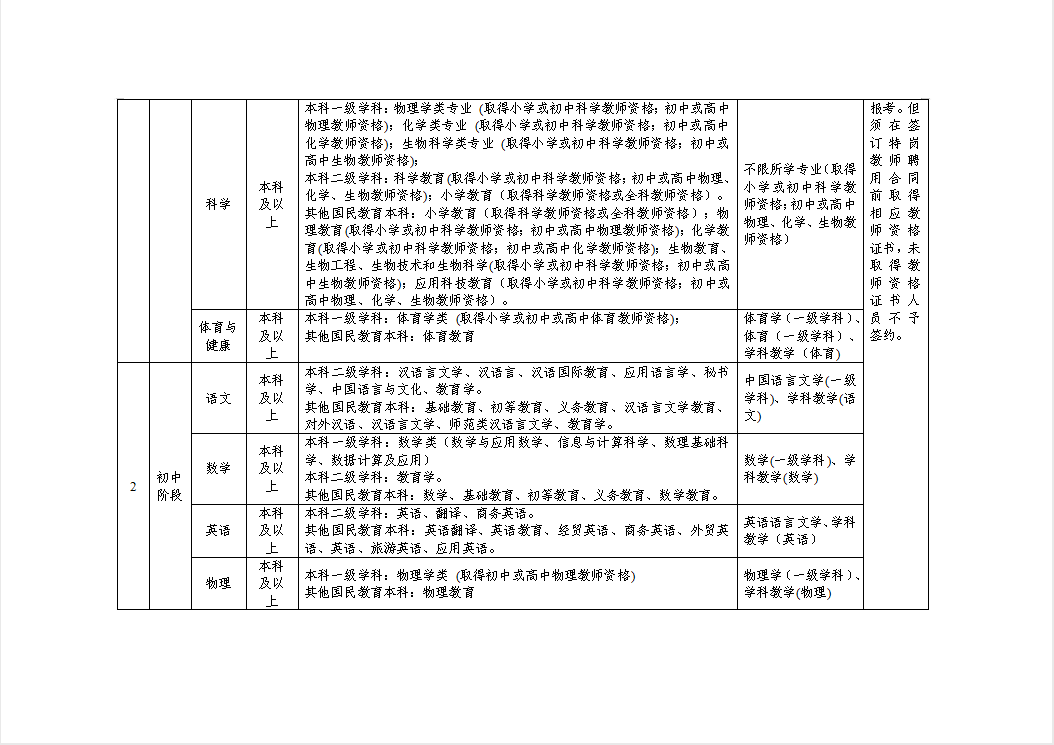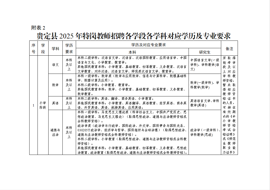 (五)招聘岗位学历及专业要求详见《贵定县2025年特岗教师招聘各学段各学科对应学历及专业要求》(附表2)。