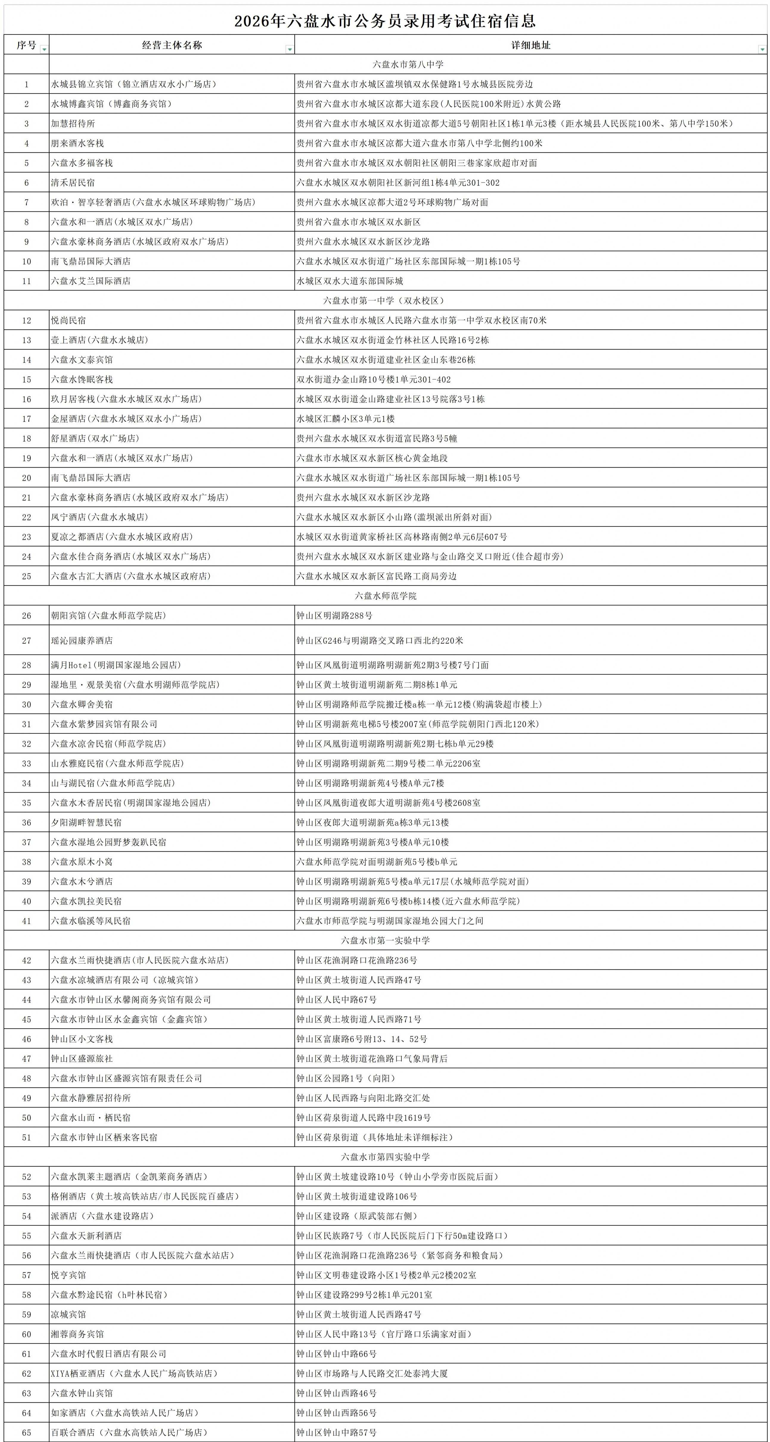 贵州省2026年省、市、县、乡四级机关统一面向社会公开招录公务员(人民警察)和省、市两级机关公开遴选公务员六盘水考区笔试将于2026年3月14日—15日在六盘水市进行,为做好广大考生在六盘水市考试期间服务工作,现将六盘水市有关住宿信息提示如下: